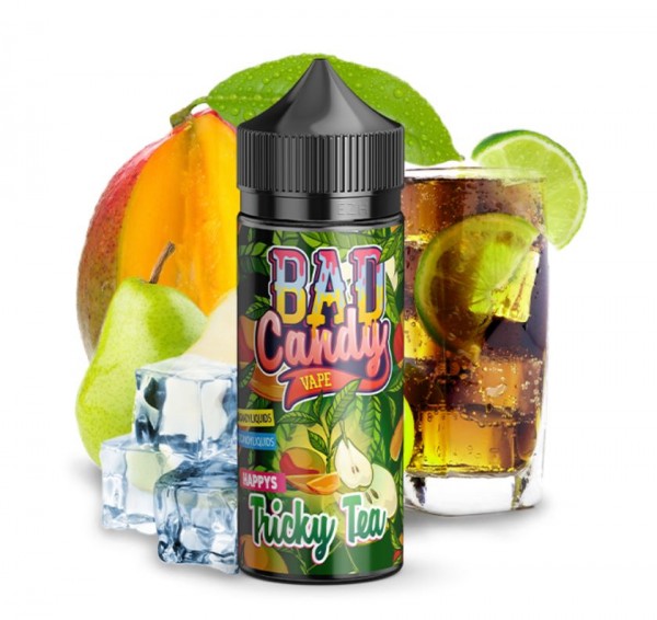 Das Bad Candy Tricky Tea Aroma ist ein Mix aus grünem Tee, einem sanften Cooling und verschiedenen Früchten.
